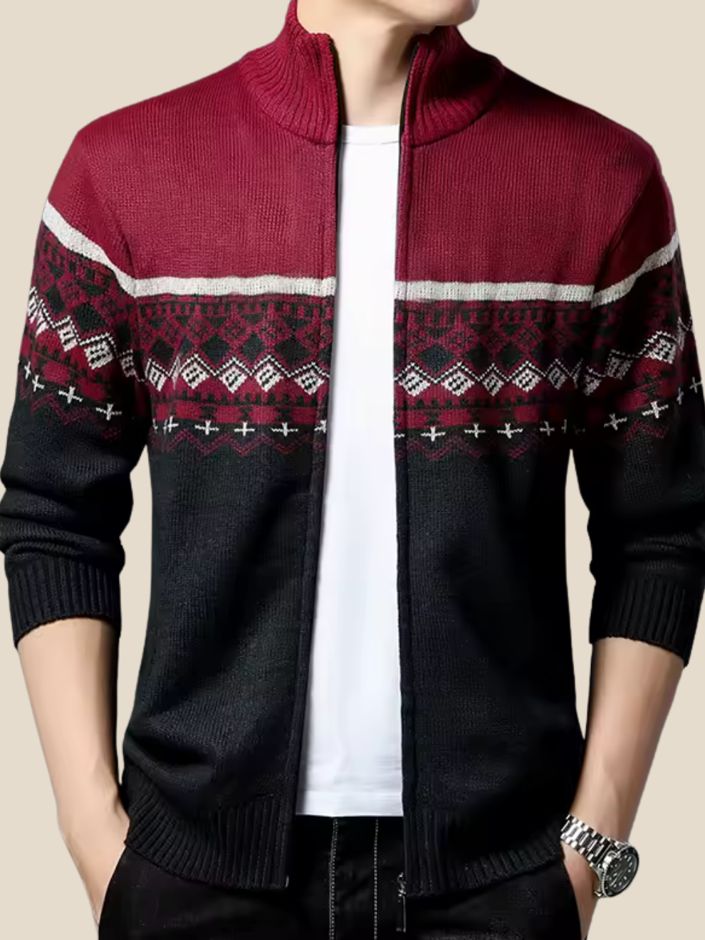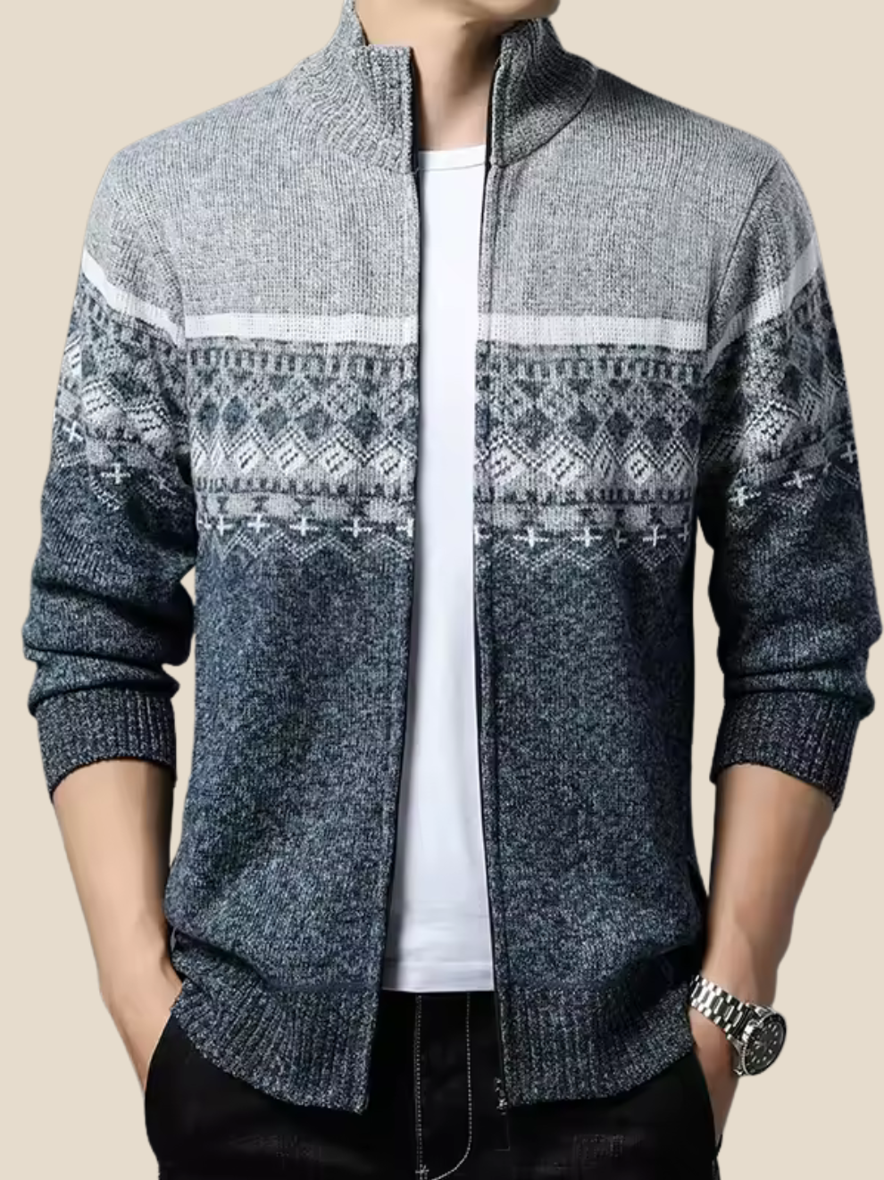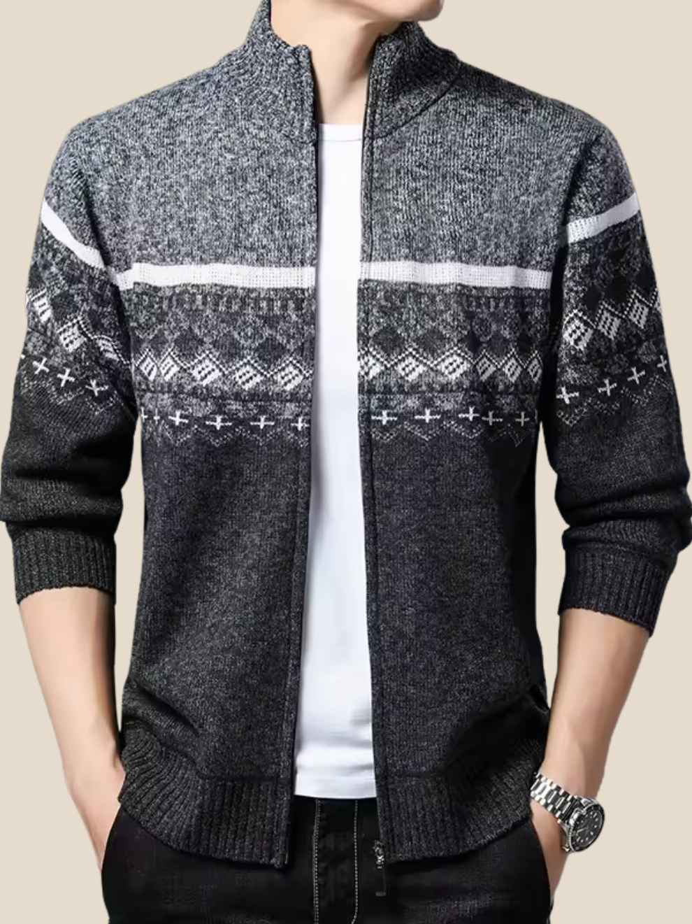 Sune | Strikcardigan med mønster giver øjeblikkelig varme og et markant nordisk udtryk. Den bløde, uldlignende strik føles behagelig mod huden og falder pænt uden at virke tung. Den høje krave kan bæres åben for et afslappet look eller lukket for ekstra varme. Det vævede mønster løfter enhver basisstyle og gør cardiganen nem at kombinere med jeans, chinos og skjorte. Resultatet er en alsidig favorit til kolde hverdage og weekender.
