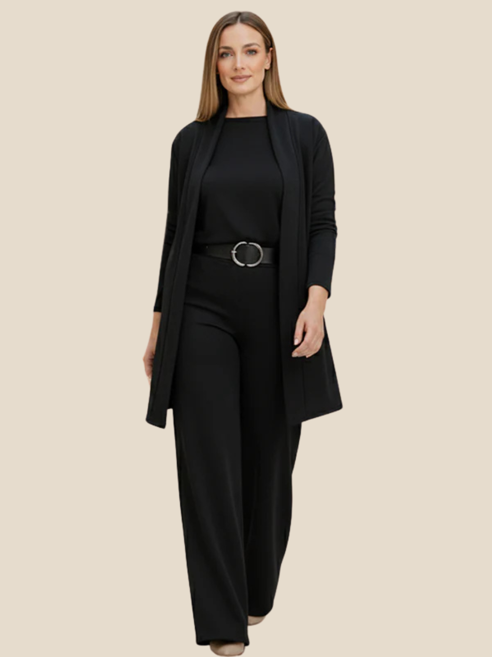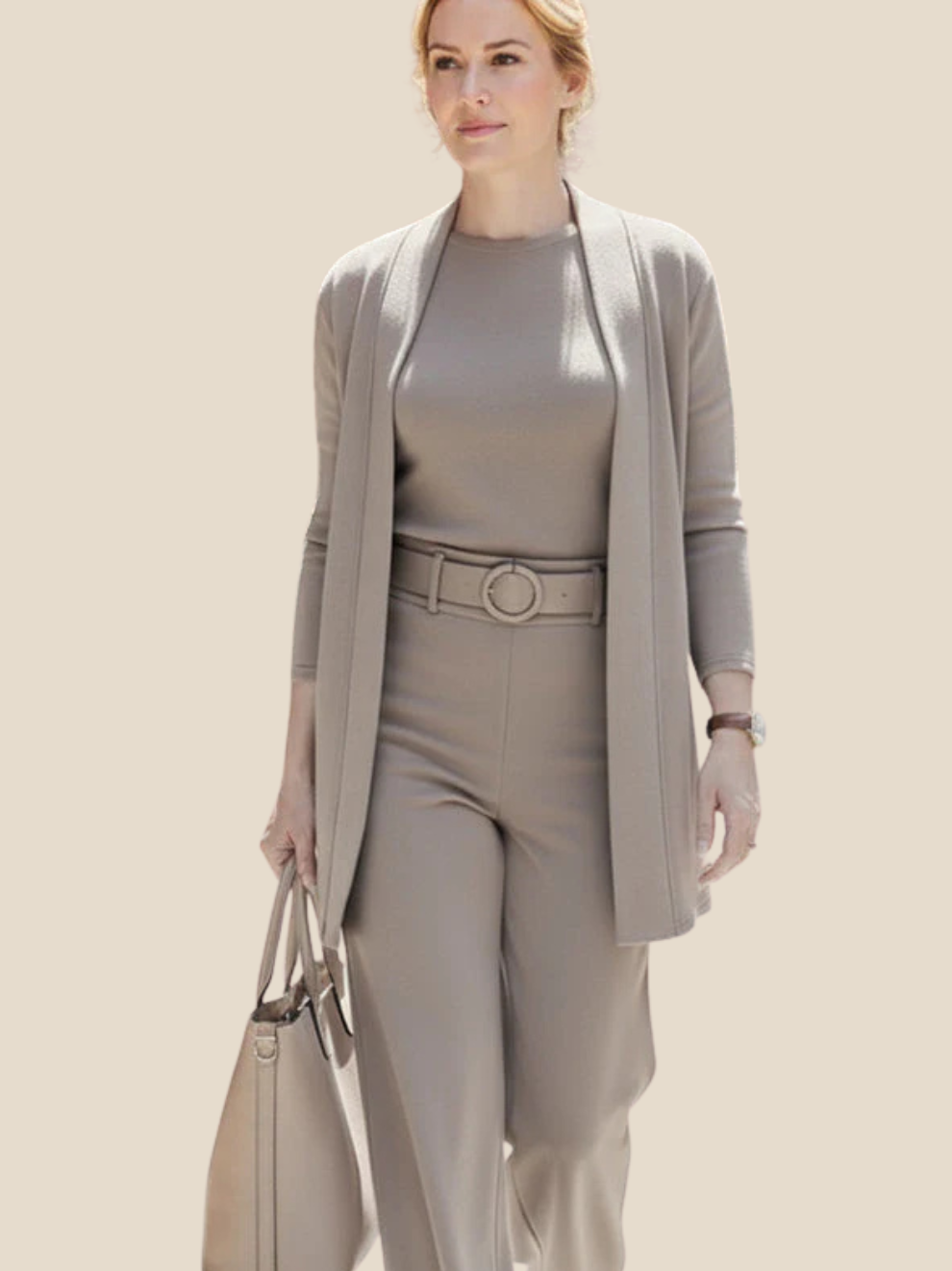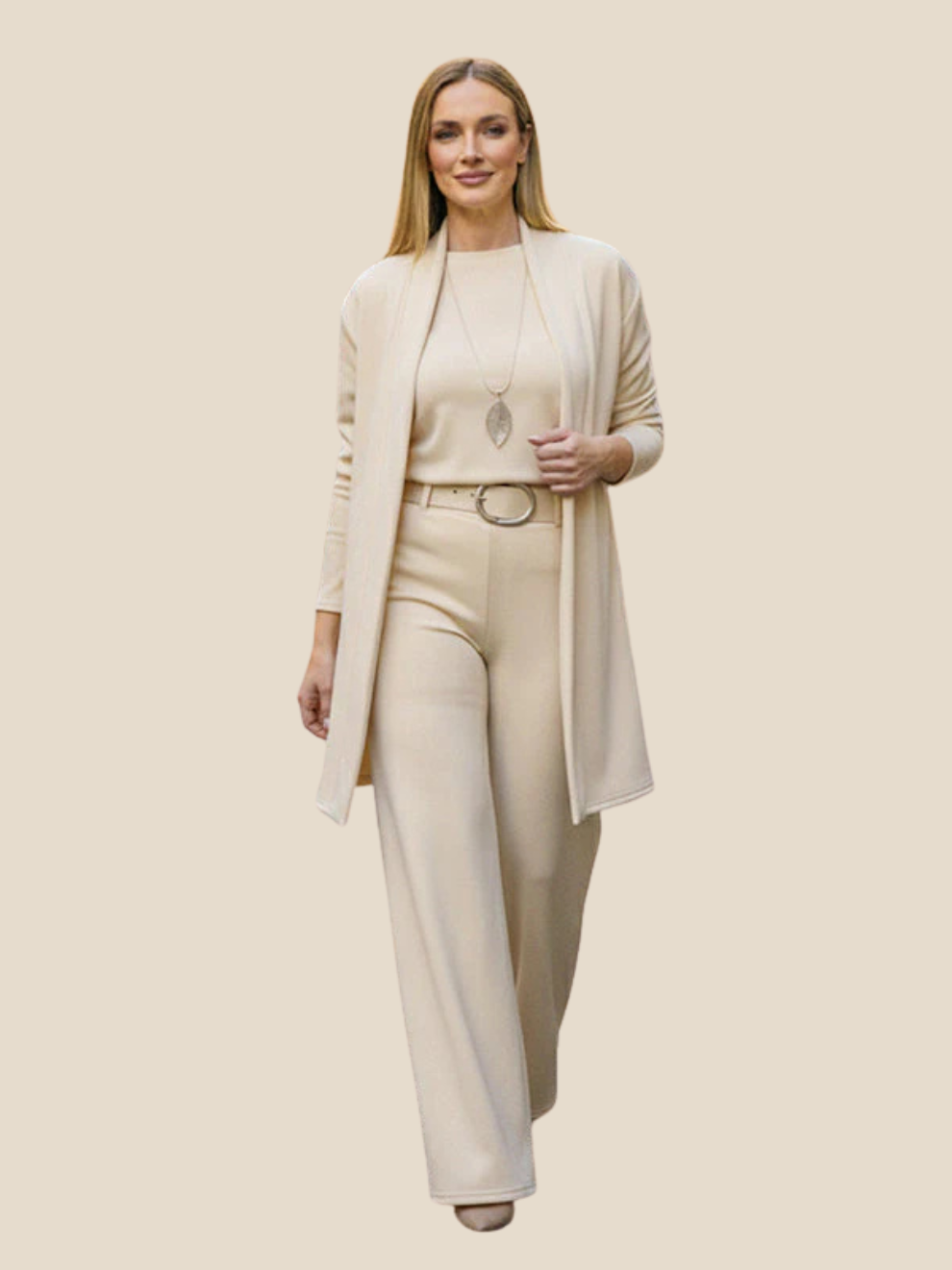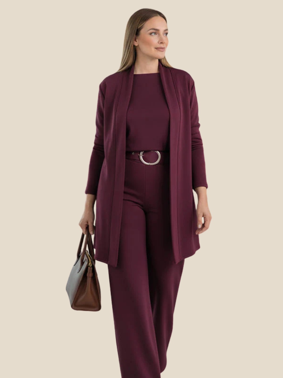 Føl dig selvsikker og elegant med Amalie tredelte sæt. Det raffinerede design og materialer af høj kvalitet giver et tidløst udtryk, ideelt til både formelle og uformelle anledninger.