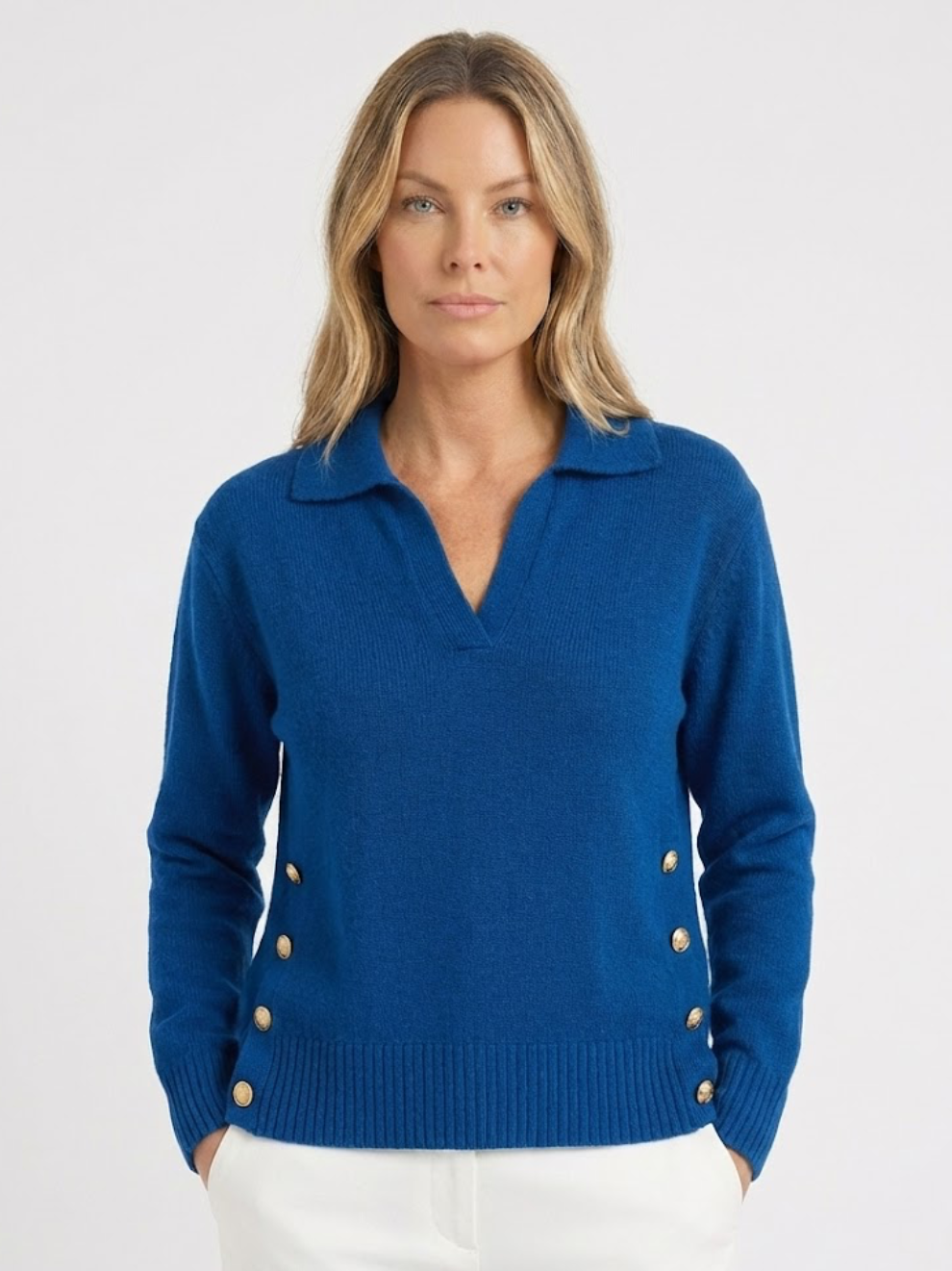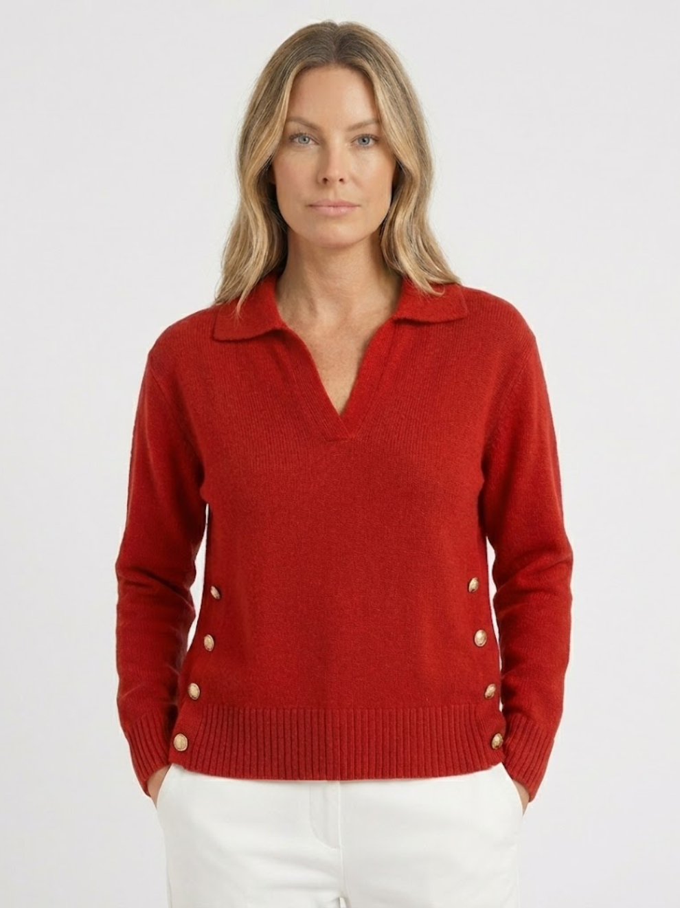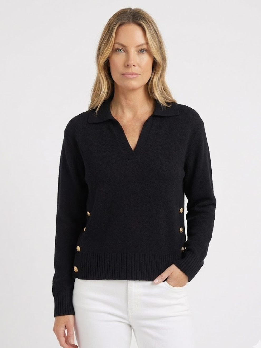 Blød, varm og stilfuld på samme tid — Lora er den striktrøje, du altid rækker ud efter. Med sin flatterende V-hals, skjortekrave og de elegante guldfarvede knapper i siderne giver den et sofistikeret look, uden at du går på kompromis med komforten.