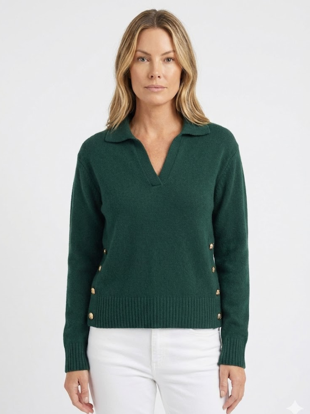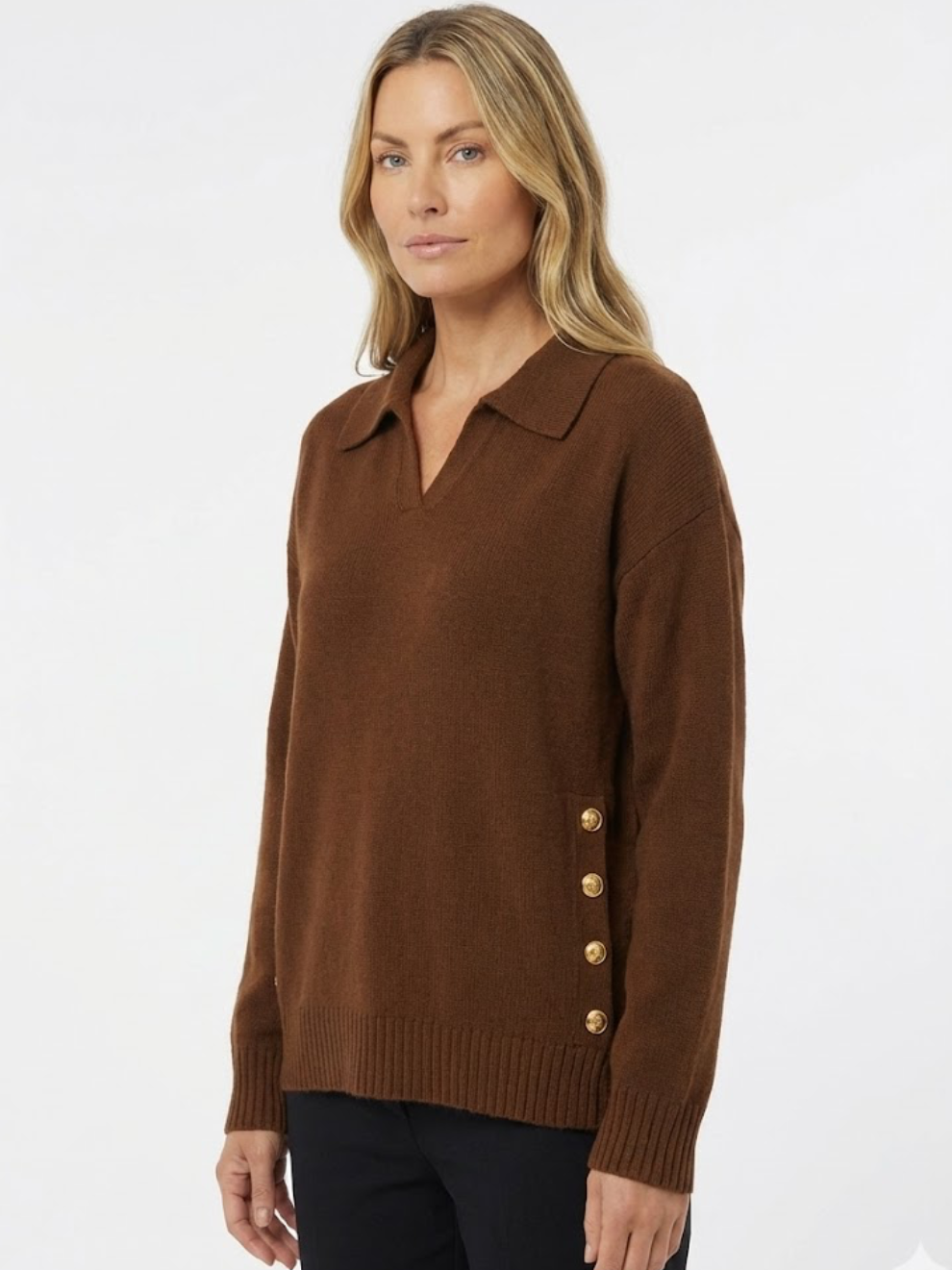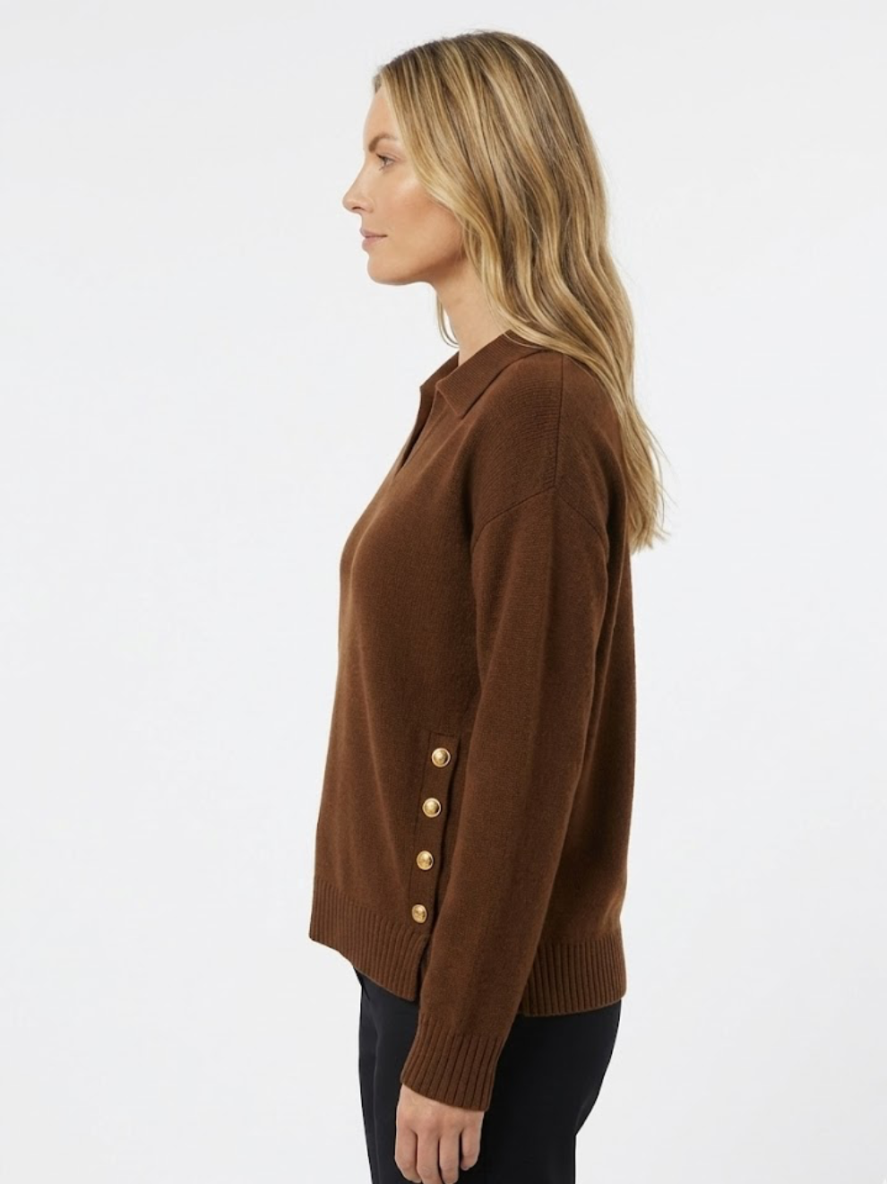 Blød, varm og stilfuld på samme tid — Lora er den striktrøje, du altid rækker ud efter. Med sin flatterende V-hals, skjortekrave og de elegante guldfarvede knapper i siderne giver den et sofistikeret look, uden at du går på kompromis med komforten.